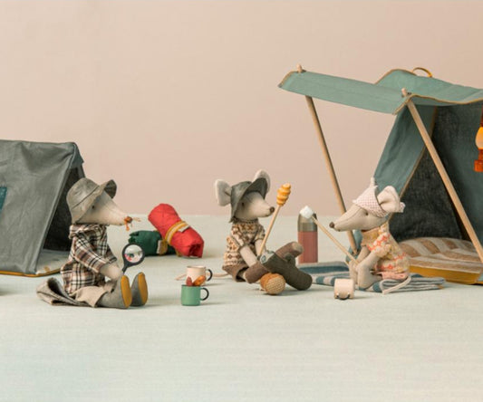 Tillfälligt slut i lagerMaileg – Vildmarksguide, Wildlife guide mus med sovsäck, förstoringsglas och magneter i händerna