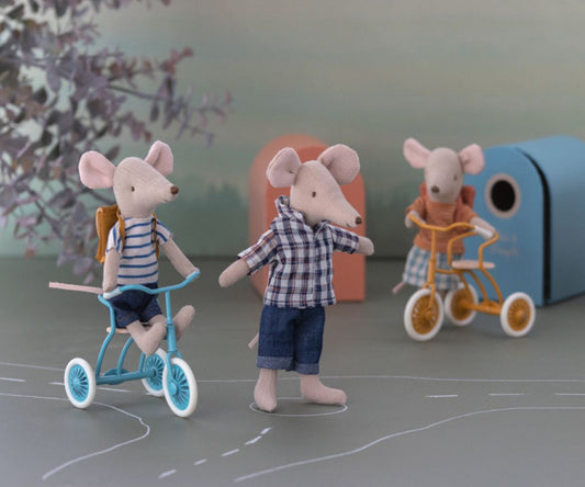 Maileg – Storebror cykelmus, bror mus med kläder och väska, magneter i händerna