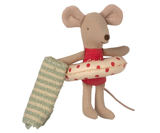 Maileg – Lillasyster mus, syster strandmus i röd badhytt med baddräkt och badring (slutsåld kollektion)