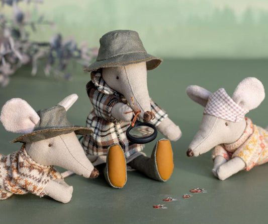 Maileg – Storebror vandrarmus med hatt, brunrandig tröja och bruna byxor, mus med sovsäck och magneter i händerna