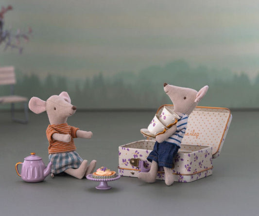 Maileg – Teservis med tårta på serveringsfat, kanna, koppar och tallrikar i väska, Purple Madelaine