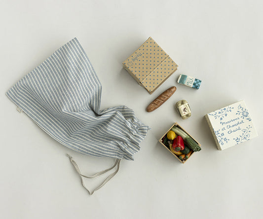 Maileg – Tygpåse med ränder i sand / blå petrol, vitt randigt band