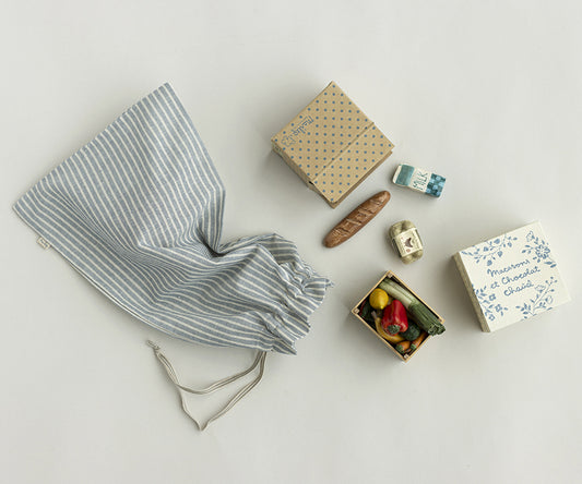 Maileg – Tygpåse randig blå och vit i linne, påse med blå ränder off white