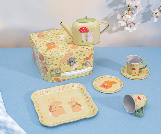 Leksaksservis i väska med kaniner och djur i trädgård, teservis i plåt, barnservis