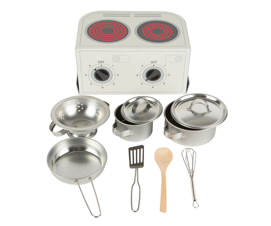 Matlagningsset i grå väska med stjärnor, kastruller och köksredskap