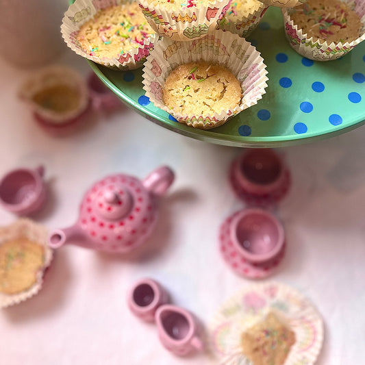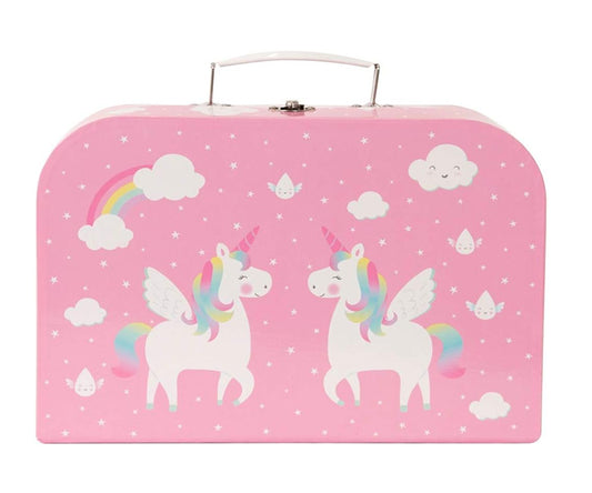 Leksaksservis i rosa väska med enhörning och regnbåge, teservis i plåt, barnservis unicorn
