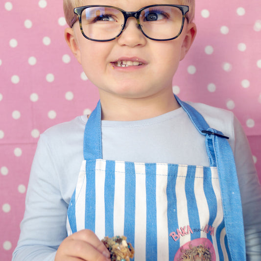 Bake with Alma - Apron, striped blue and white with purple pocket