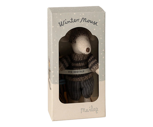 Maileg – Stickad tröja och mössa bror mus, virkade bruna kläder för storebror mus i jul