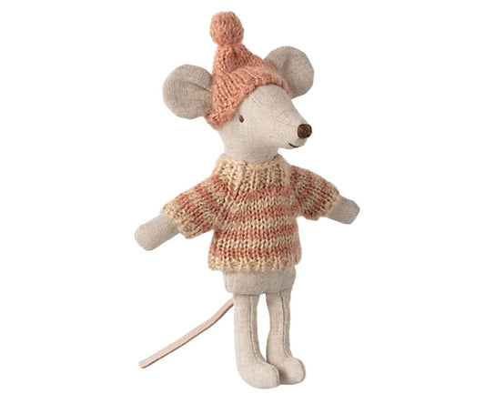 Maileg – Stickad tröja och mössa syster mus, virkade rosa kläder för storasyster mus i jul