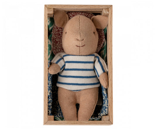 Maileg – Liten gris i låda, baby pojke med filt, kudde och madrass