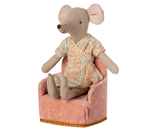 Maileg – Rosa fåtölj i miniatyr till möss, stol puderosa med guldig detalj