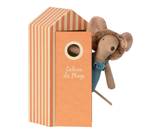 Maileg – Mamma mus, strandmus i baddräkt och hatt med badhytt / strandhus