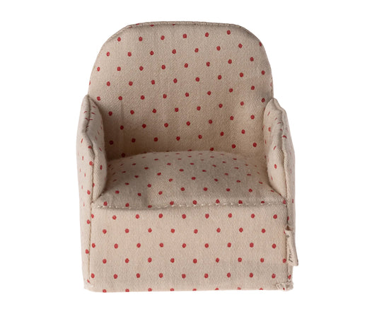 Maileg – Prickig fåtölj i miniatyr till möss, stol vit med röda prickar (slutsåld kollektion)