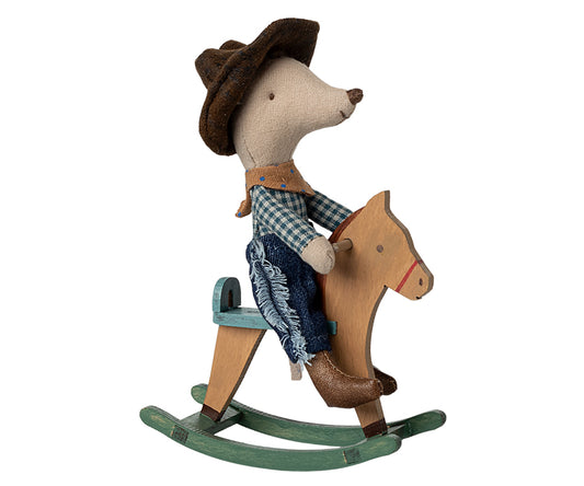Maileg – Cowboymus på gunghäst, lillebror mus som cowboy med cowboyhatt och häst i trä
