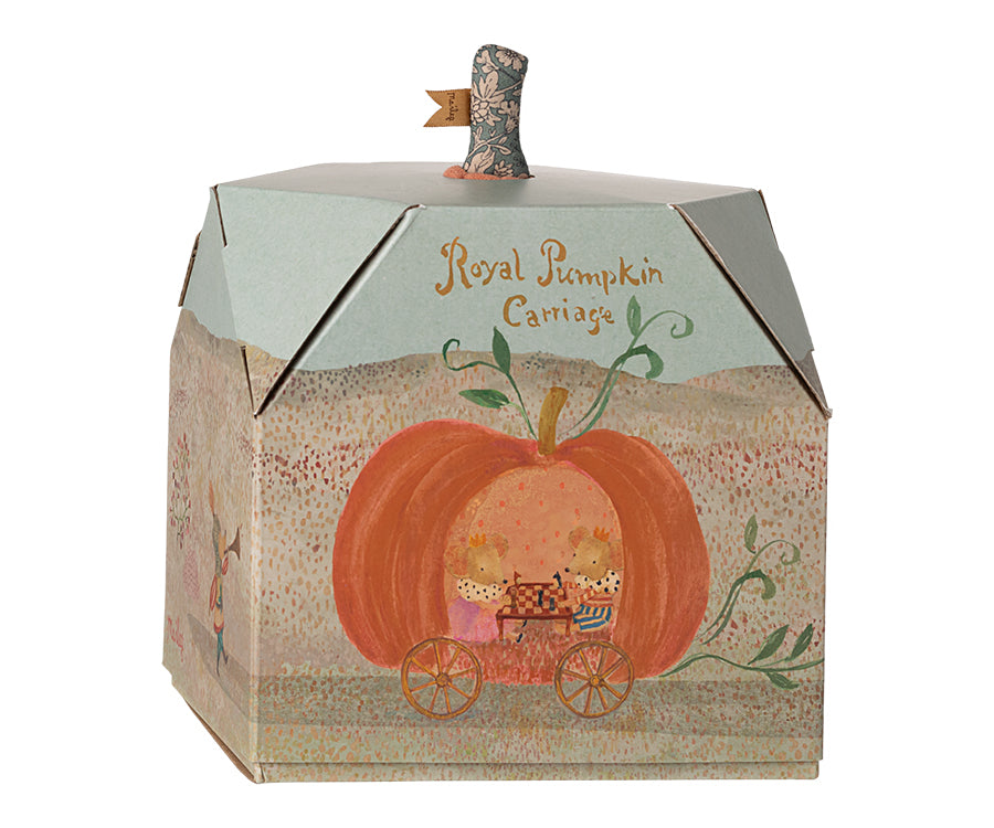 En underbar liten pumpavagn för möss som är den perfekta vagnen att skjutsa den kungliga musfamiljen i när de måste ge sig iväg utanför slottet. Låt denna vackra rosa pumpa med fina detaljer bli en magisk färdkost för dina små möss. Vagnen har hjul och ett fint band och är gjord i finaste tyget. Låt sagan och leken börja!