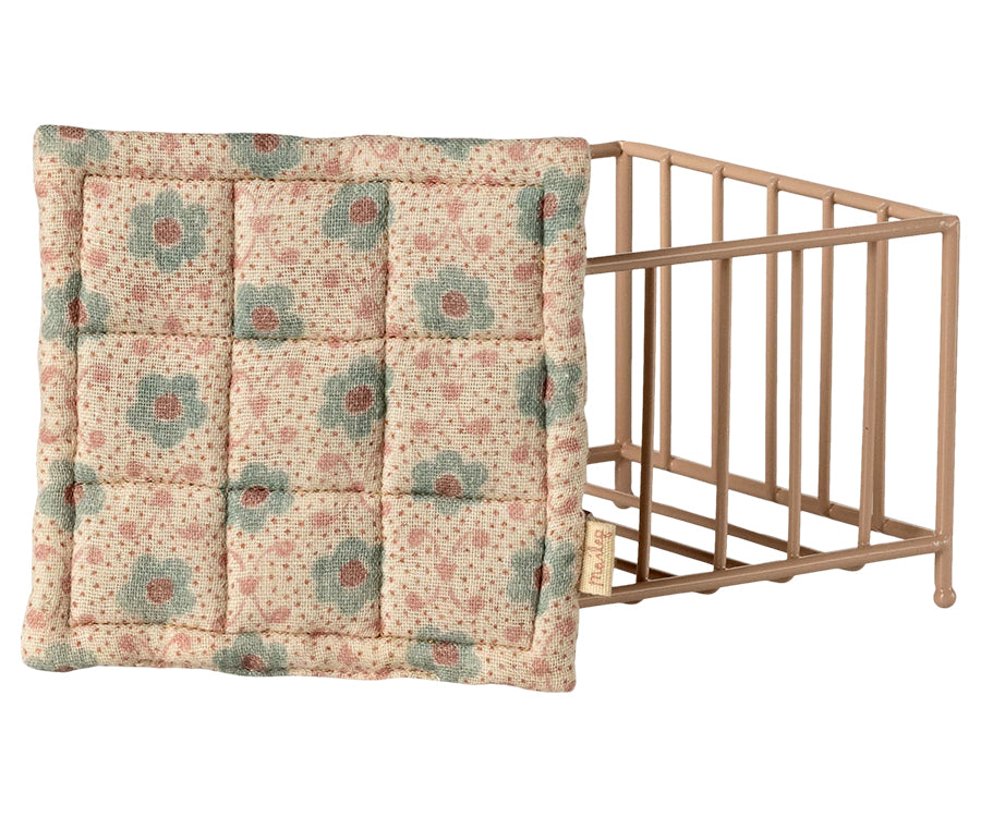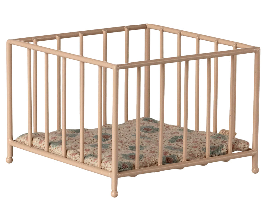 Liten söt lekhage i metall med madrass som är perfekt för små babymöss eller kaniner i storlek My. Låt Maileg musen eller kaninen få leka i denna hage eller vila en stund. Denna fina säng med madrass för bebis kanin eller mus är i metall och är en perfekt möbel till dockhuset eller dockskåpet. Denna babysäng passar bra i sovrummet eller lekrummet i Maileg-huset och förgyller leken med de små bebisarna.