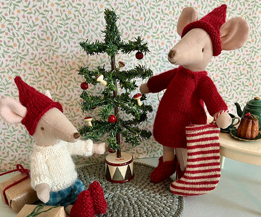 Tillfälligt slut i lagerMiniatyr – Stickad röd tomteluva till möss i 3 olika storlekar