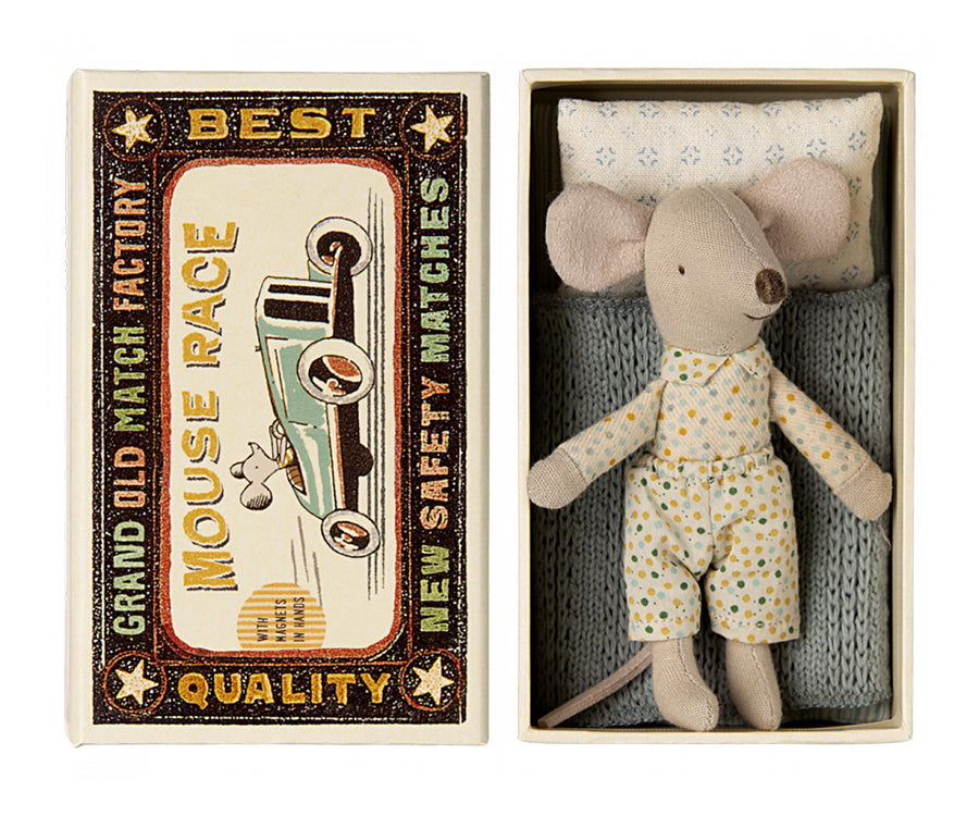 Maileg – Lillebror mus med prickiga kläder i tändsticksask, magneter i händerna