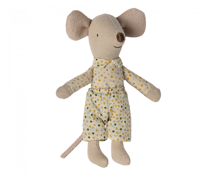 En fin liten lillebror mus med magneter i händerna, ett klassiskt Maileg objekt. Denna lilla mus med prickig överdel och prickiga byxor är den perfekta lilla musen för flera timmars lek. Den sover gott i sin lilla ask med finaste sängkläderna. En perfekt present att ge bort på kalaset!